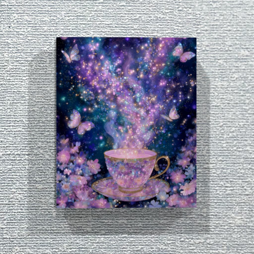 花蜜ティーとその周りに集まった蝶の幻想的なファブリックパネルです。