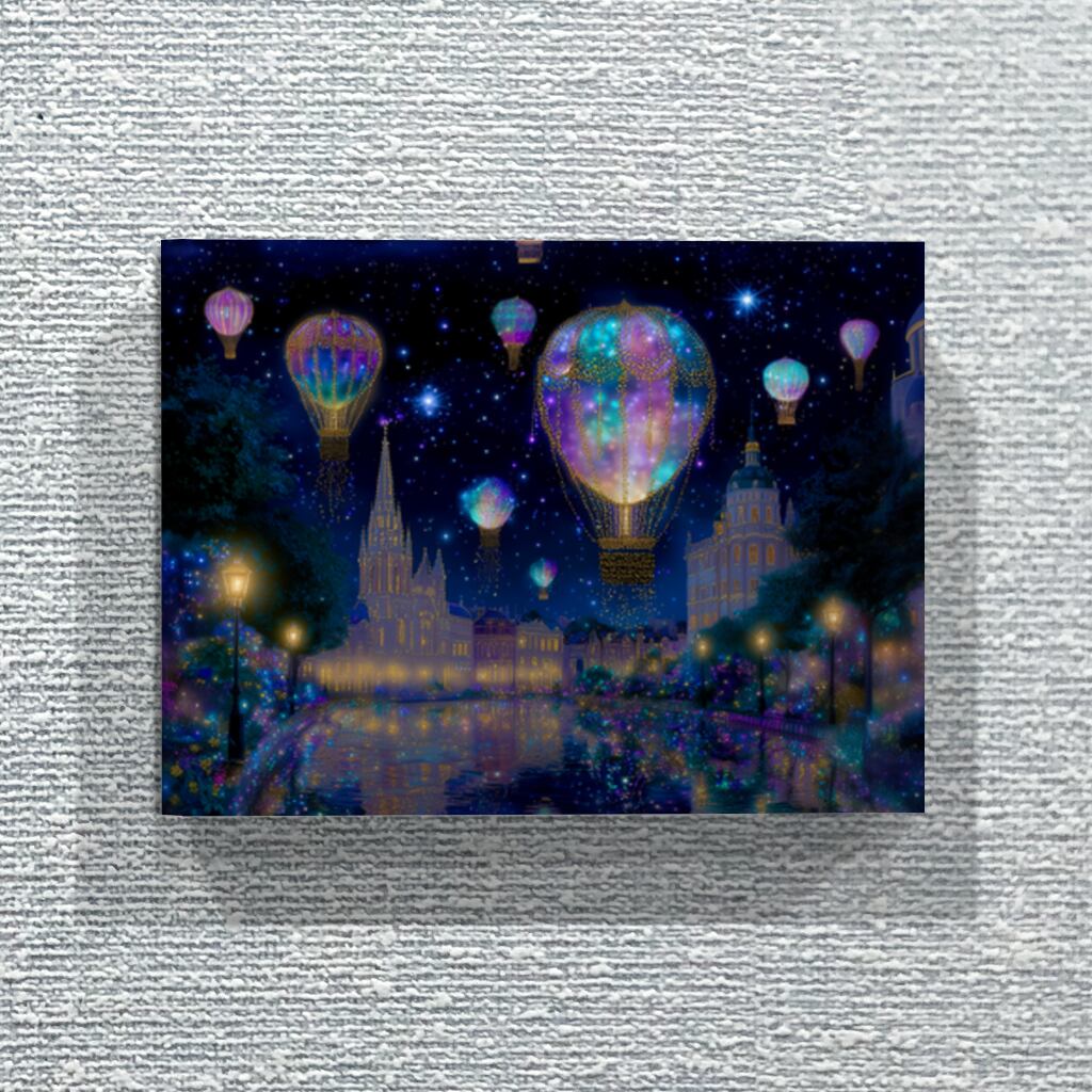 夜の街に浮かぶ気球のファブリックパネルです。
